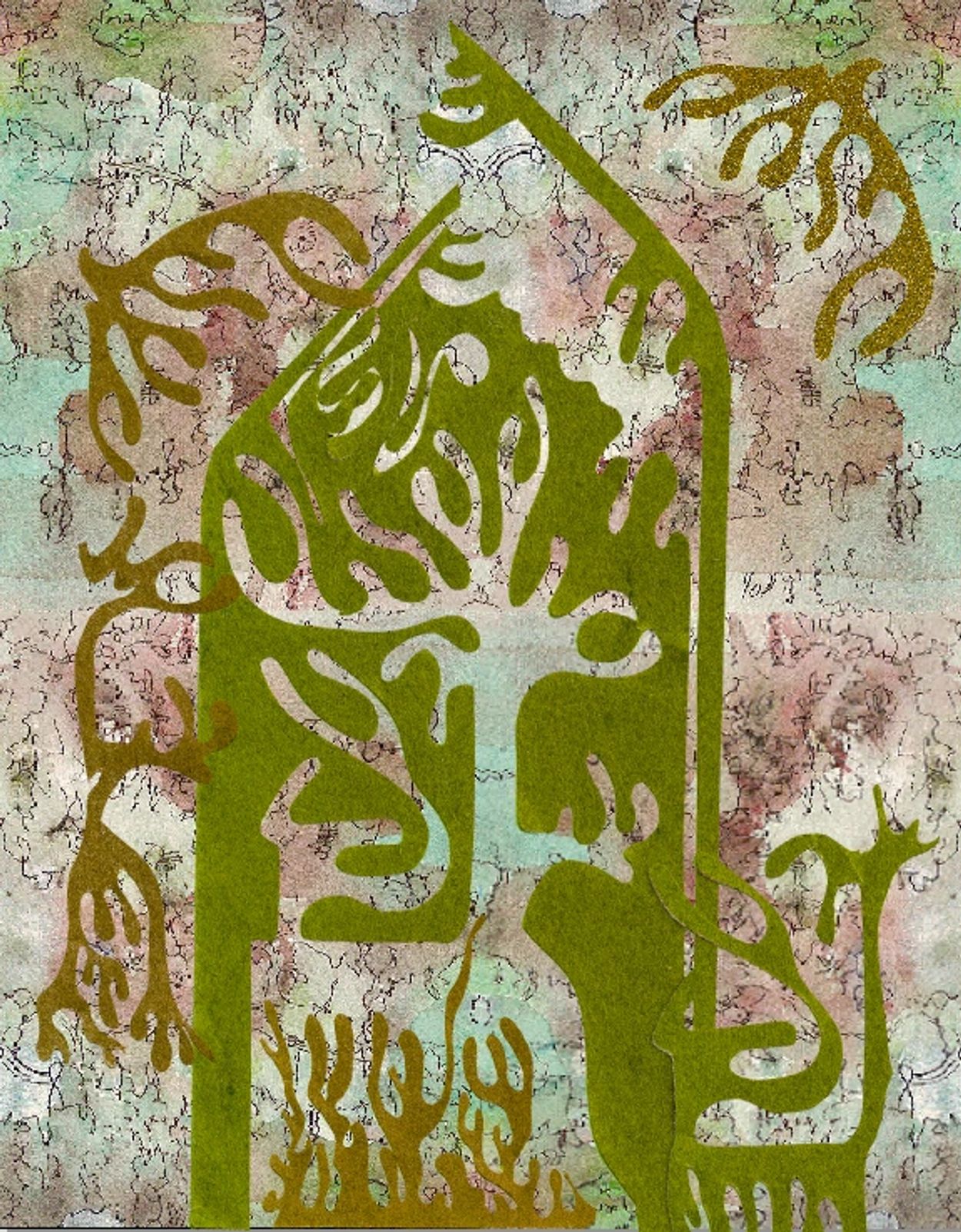 "Root Cathedral" © SH Bingham. Cut paper over watercolor and ink.